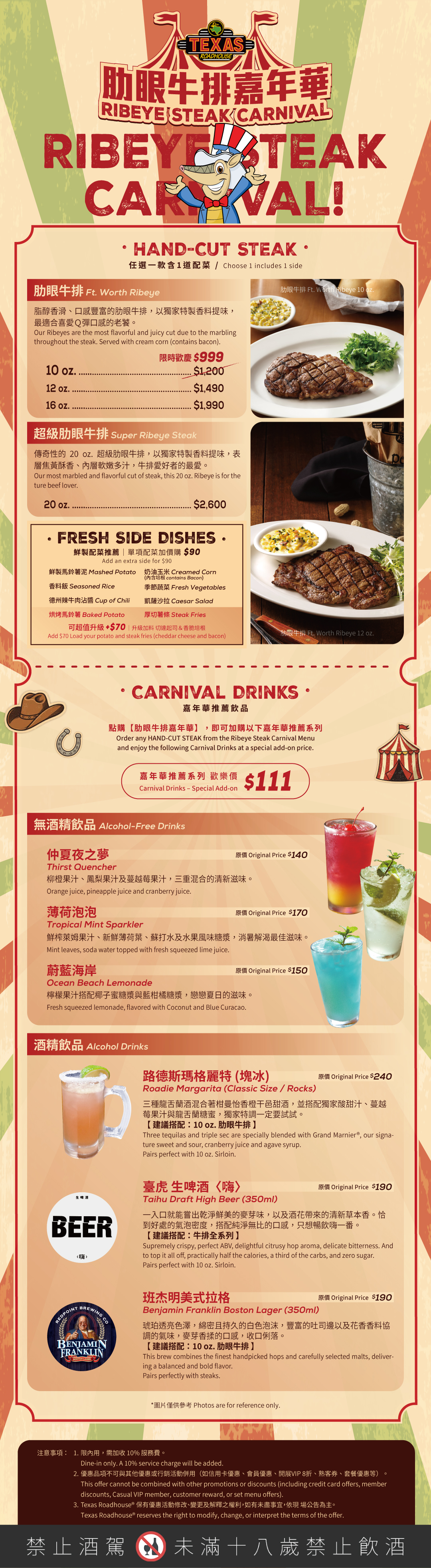 Texas Roadhouse 德州鮮切牛排 11 週年限定,10/21 ~ 11/11,限時推出【肋眼牛排嘉年華】,一起大口開吃吧!