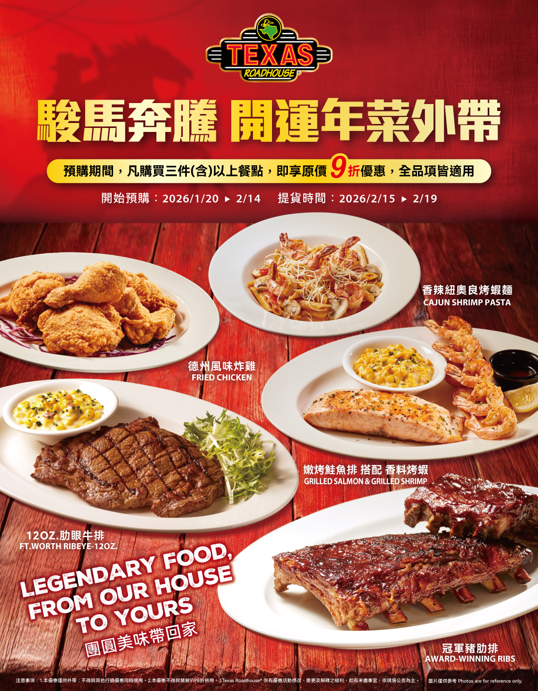 Texas Roadhouse 首次開放全品項餐點皆可外帶預購,多樣人氣主餐、配菜或分享餐點,都能自由搭配你的團圓菜單。